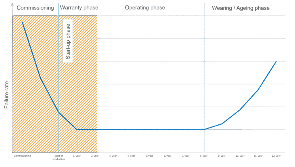 Tijdens de inbedrijfstelling ligt de focus op functionele en kwaliteitstesten van afzonderlijke systeemcomponenten. Onder tijdsdruk komen echter vaak onverwachte en niet-reproduceerbare afwijkingen in de PROFINET-communicatie voor. Dit is niet ongebruikelijk, zoals de “badkuipcurve” in de onderstaande grafiek laat zien. Toch blijft telkens dezelfde vraag terugkomen: waarom nu, terwijl alles hiervoor perfect werkte?