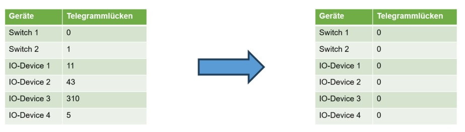 Het optreden van een telegram gat is een betrouwbare vroege indicator en dus belangrijke informatie voor het beoordelen van de kwaliteit van PROFINET-dataverkeer. Een apparaat gerichte melding biedt een duidelijk beeld van de netwerktopologie, waardoor het mogelijk wordt de oorzaak (defecte kabel, ruggengraataansluiting, connector, apparaat) of de oorsprong (EMC-problemen) nauwkeurig te identificeren. Even belangrijk is de mogelijkheid om het succes van een apparaat vervanging te verifiëren door een voor- en nameting te vergelijken.